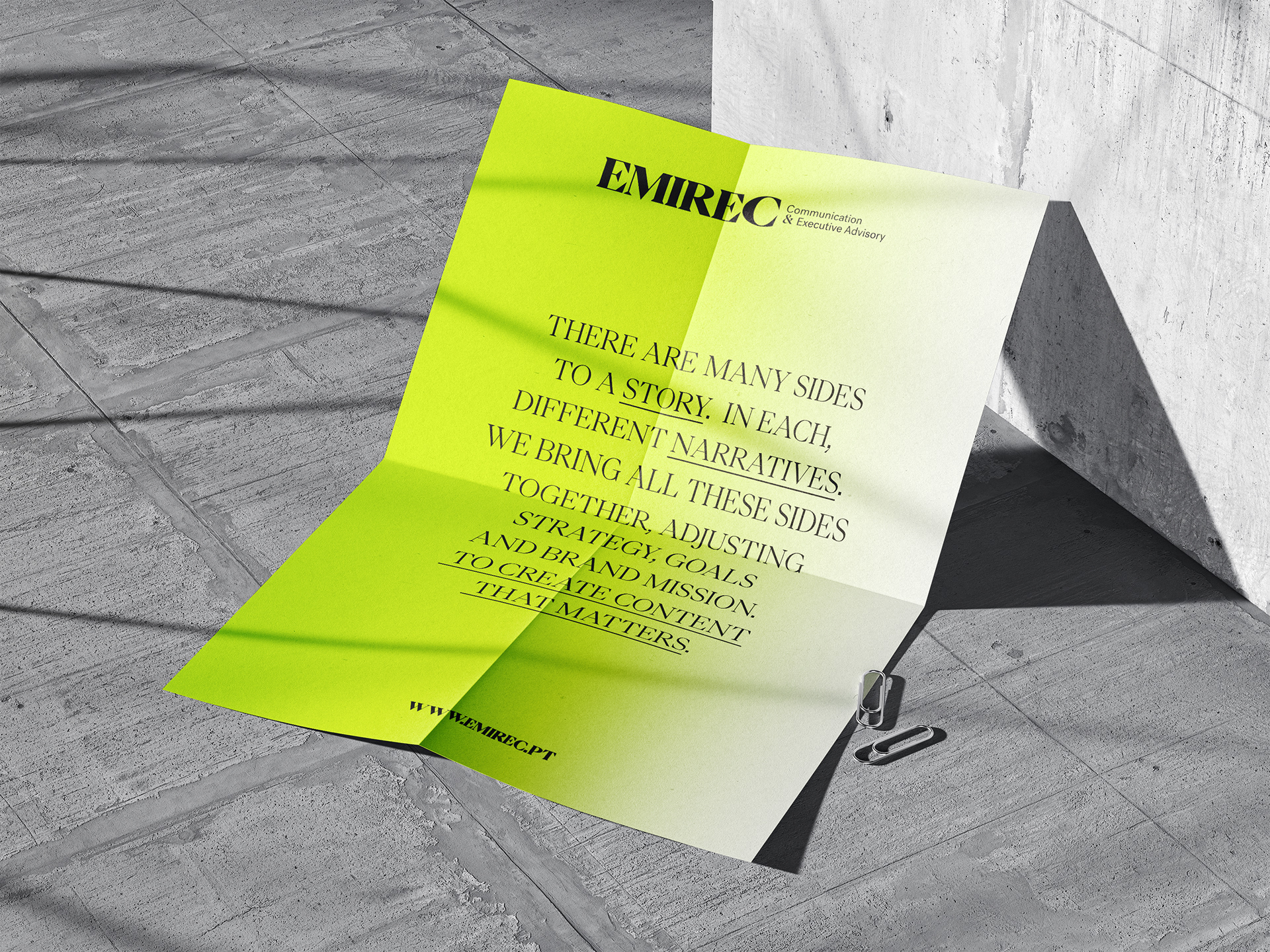 Rebranding da agência de comunicação EMIREC. Quisemos contar uma história através das suas várias perspectivas. Reposicionamento de marca, criação de assinatura, website e look & feel.